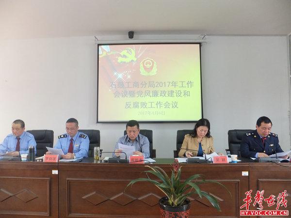 华声在线衡阳4月8日讯(黄亚辉 通讯员 李田木)4月6日上午,石鼓工商分局在六楼会议室召开2017年工作暨党风廉政建设和反腐败工作会议,市局党组成员副局长周新春、石鼓区政府副区长吴颖亲临会议指导,会议由党委副书记、副局长肖文章同志主持。