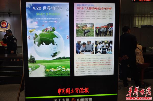 该局通过在县局大门口电子显示屏滚动宣传主题词,在县政务中心和不动产登记中心等窗口的群众办事大厅,通过国土大屏滚动播放宣传海报及世界地球日公益广告——资源篇,利用局门户网站、微信平台进行宣传,介绍世界地球日的起源、活动意义,倡导给资源喘息空间,让生活充满绿色,并利用电视及户外电子频道宣传,在县电视台《经济生活频道》黄金时段、县城船山广场、明朝广场、蒸阳车站等户外电子频道滚动播放该县国土资源节约集约模范县创建专题片及国土相关法律法规知识,增强了广大人民群众对全县国土资源的保护与利用的意识。