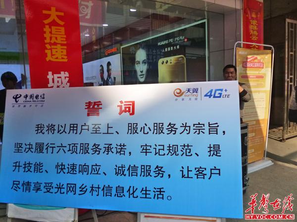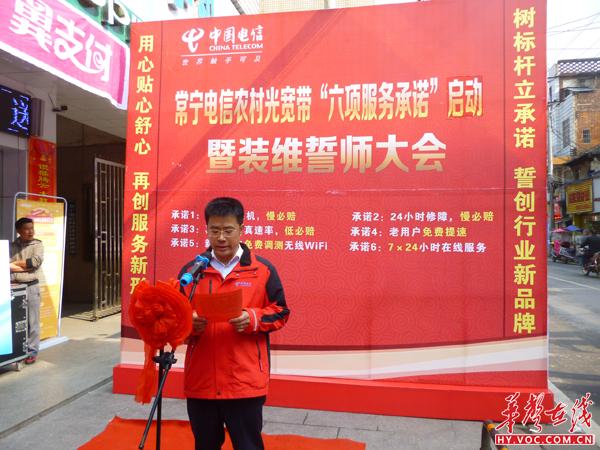活动现场,该公司党委书记、总经理邓卫民代表中国电信常宁分公司向消费者郑重承诺:一天装机,慢必赔;一天修障,慢必赔;真宽带,真速率,低必赔;老用户免费提速;新装用户免费调测无线WIFI;7×24小时在线服务。全体电信装维人员统一着装,整齐列队,高举右手,庄严宣誓:“我将以用户至上、用心服务为宗旨坚决履行服务承诺,牢记规范,提升技能,快速响应,诚信服务,让客户尽情享受光网乡村信息化生活。”
