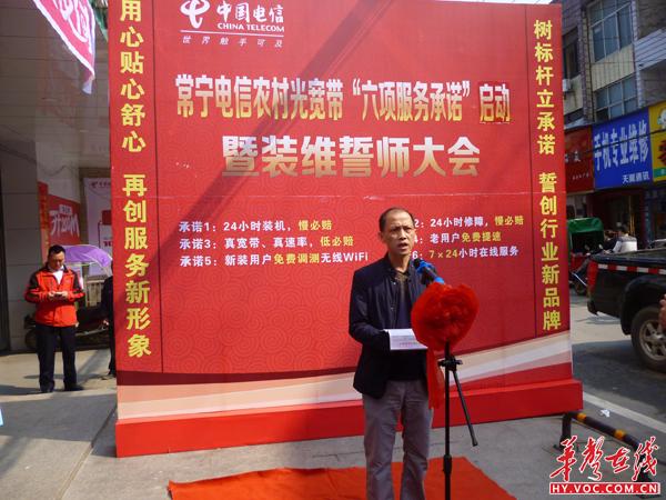 华声在线衡阳站5月2日讯(吴洪江 通讯员 胡双富)4月28日,中国电信常宁分公司在解放北路店前隆重举行农村光宽带“六项服务承诺”启动暨装维誓师大会,将“六项服务承诺”覆盖范围从城区扩大到农村,推进优质服务全市覆盖。这是电信公司在公用企业消费者评议活动启动后主动优化服务的一项重要措施,体现了电信公司主动保障消费者权益的决心和信心。