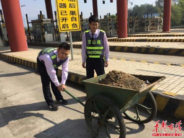 事不宜迟,收费员赵玮和廖志凯赶紧回到站内,取来铁锨、扫把、推车等工具,经过20多分钟的努力,他们将现场及时清理干净,不仅消除了安全隐患,也为司机减少了经济损失。