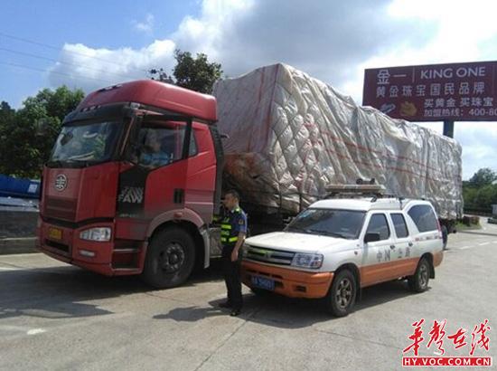 华声在线衡阳站5月5日讯(吴长发 通讯员 汪兴)5月4日10时许,衡阳高速公路管理处水口山路政中队巡逻人员汪兴、王鸿儒巡查至G72东往西方向洪市服务区时,发现一辆牌照为湘DA6141的半挂车存在超限运输嫌疑,巡逻人员立即对其进行调查了解,经测量核实该车车货总高达到5.6米,远远超过规定的车货4米高度,属于违法超限运输车辆。