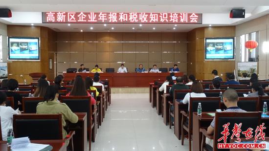 华声在线衡阳站5月5日讯(黄亚辉 通讯员 贺嵩 赵芳)为宣传商事制度改革和税收知识,强化企业信息公示,提升企业诚信和依法纳税意识,5月4日下午,在衡阳高新区管委会五楼会议室召开“企业年报和税收知识”培训会。高新区管委会领导、高新区财政局、高新区工商分局、高新区国税局、高新区地税局、高新区统计局、高新区经发局、高新区市场主体代表等100余人参加了培训会。会议由高新工商分局副局长廖筱锋主持。