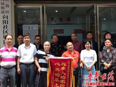 华声在线衡阳站6月9日讯(黄亚辉 通讯员 谢俊芳 李瑞娜)6月7日上午,衡阳市石鼓区人民街道向阳社区残疾人日间照料站托养人员陈志强、颜友桂、刘和平等人为社区赠送来一面鲜红的锦旗,锦旗上烫金的几个大字“残疾人员的家园、心灵的乐土”。