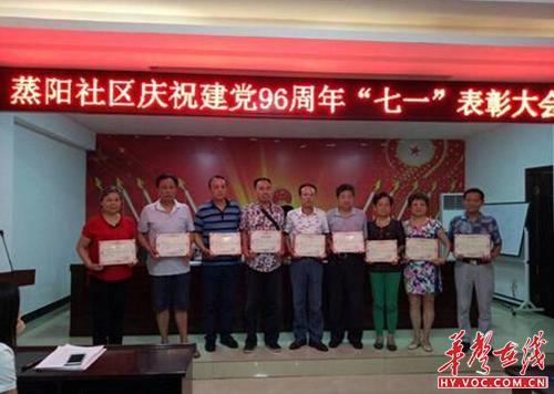 华声在线衡阳站7月4日讯(符志忠 黄亚辉 通讯员 谢桂军 杨巧慧)为庆祝中国共产党成立96周年,6月29日下午,人民街道蒸阳社区党委在社区大会议室召开了庆祝建党96周年召开“七一”表彰大会,旨在表彰先进、鼓舞士气,全面提高基层党组织的凝聚力和战斗力,进一步调动广大党员参与社区建设的积极性和主动性,共建和谐美好社区大家庭。