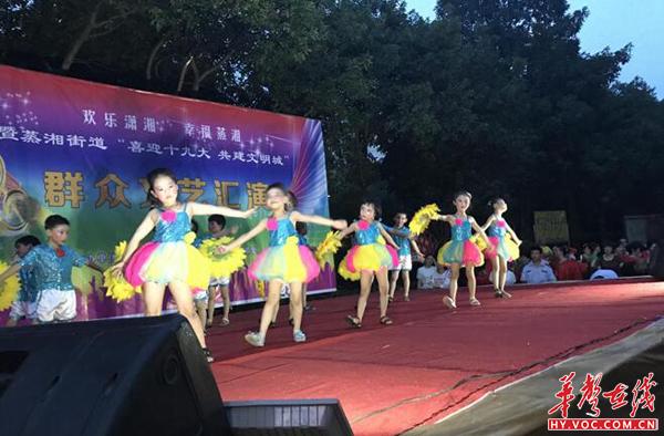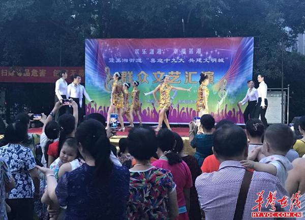 华声在线衡阳站7月14日讯(符志忠 黄亚辉 通讯员 宋俊璋)近日,蒸湘街道社区文化活动中心举办了“喜迎十九大,共建文明城”群众文艺汇演。演出人员们亮丽的服饰、精致的妆容,以及众人高涨的热情充斥太平小区中心花园,有近百名社区居民闻讯而来观看演出,活动现场人声鼎沸、热闹非凡。