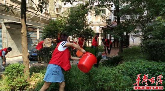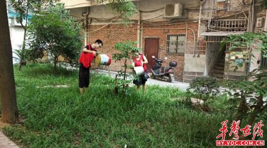 华声在线衡阳站8月1日讯(通讯员周聪)连日来高温少雨的天气,让花草树木经受了干旱。7月28日上午,衡阳蒸湘区蒸湘街道温家台社区的志愿者们对蒸阳花苑内小花园栽种的花草树木进行浇水养护。
