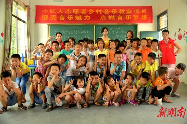 音乐也是抚慰与温暖人心的桥梁。2014年,小红人协会在走访乡村学校时发现,很多乡村学校没有音乐教师,上不了音乐课,孩子们却渴望能学音乐、学唱歌。2015年,协会联手衡阳师范学院“小百灵”志愿者协会,发起“乡村音乐教室”公益项目,自编音乐教材,筹集善款捐赠乐器、音响,组织衡阳师院音乐专业学生支教,让10万余孩子受益。