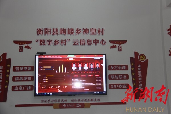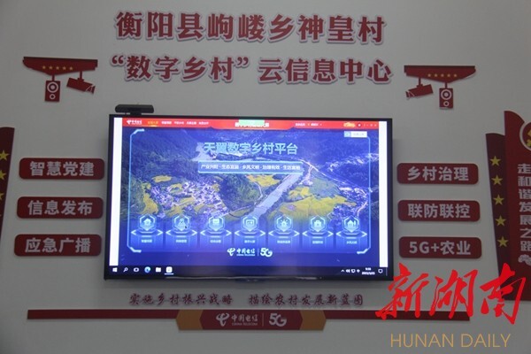 3月27日上午9时,记者来到衡阳县岣嵝乡神皇山村村部。一块天蓝色的“中国电信天翼·数字乡村”屏幕挂在村部东面墙上。村支部书记董端祥拿起遥控器轻点按钮,打开了中国电信天翼·数字乡村平台。