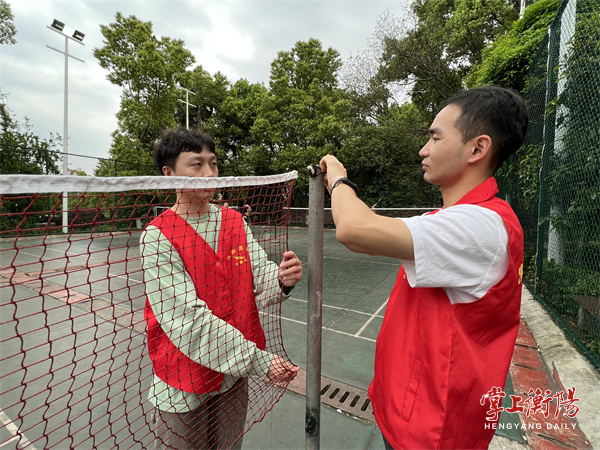 当日下午,身穿“衡阳群众”红马甲的刘振武、陈心成、肖源源、于豪等青年志愿者热情高涨、干劲十足,不留死角地将公共区域内的杂草、落叶、生活垃圾清扫干净,并将乱停乱放的共享电动车挪至统一设置的车位。途中,刘振武还用自己节省下来的生活费购置了一批羽毛球网,并在热心市民的帮助下,对平湖公园羽毛球场的破损球网进行拆卸换新。