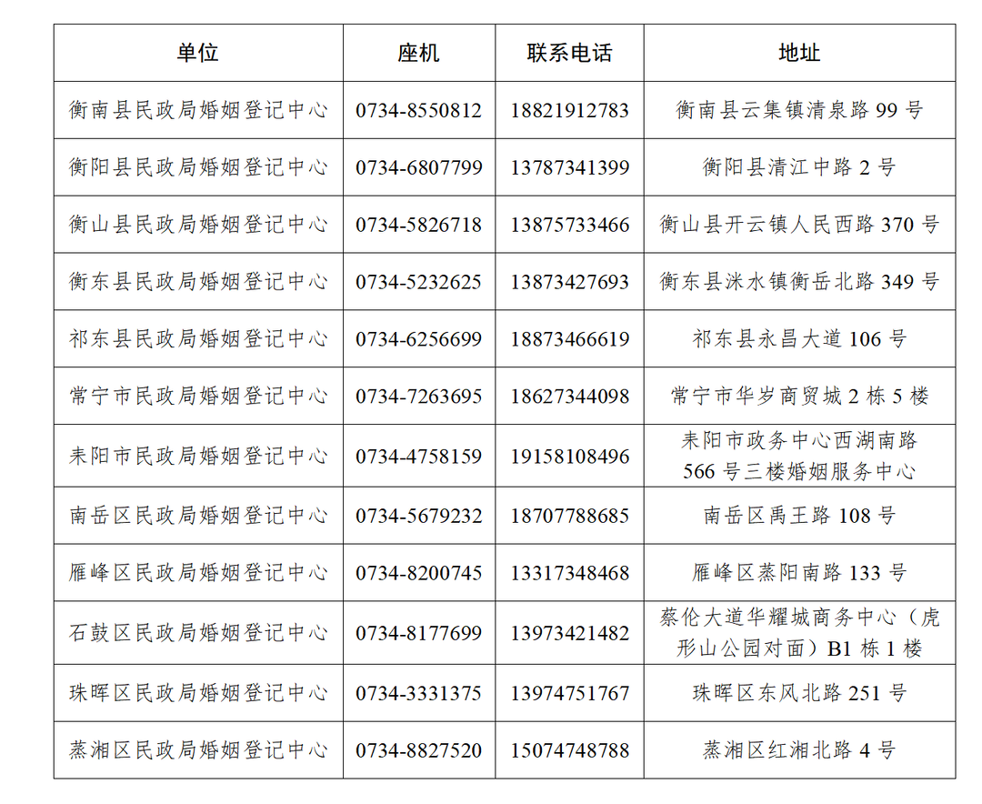 衡阳各县(市、区)民政局婚姻登记中心联系方式