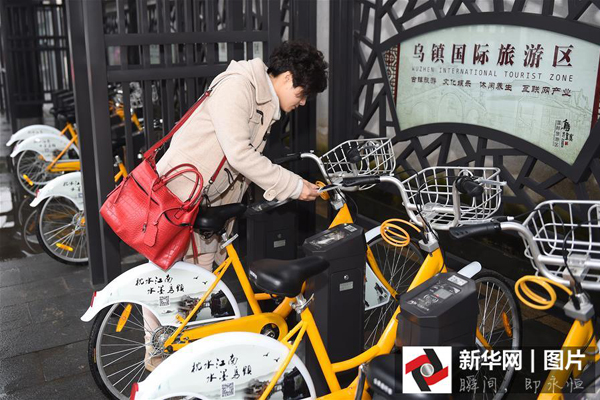 乌镇居民体验用手机微信扫码租用自行车(12月10日摄)。 新华社记者黄宗治摄