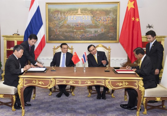 2014年12月19日,李克强与泰国总理巴育共同见证中泰铁路合作备忘录签署。新华社 黄敬文 摄