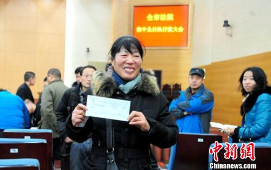 资料图:2015年春节前,为了让申请执行人安心过年,2月11日上午,徐州市中级人民法院组织全市两级法院开展集中兑现执行款活动。图为一名申请执行人从法院工作人员手中接过执行款。李荣信 摄