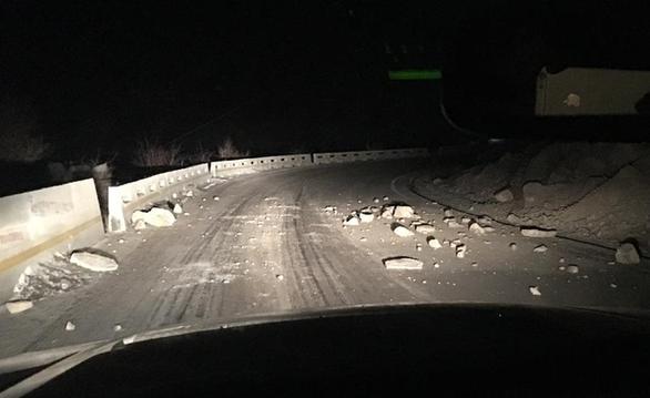 在距离门源县城45公里的黑泉水库,碎石滚落到公路上(1月21日摄)。