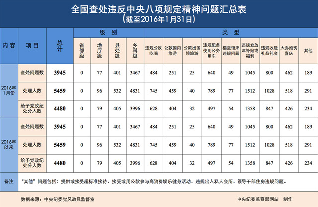 为掌握全国贯彻落实中央八项规定精神情况,中央纪委在31个省区市和新疆生产建设兵团、139个中央和国家机关、111个中央企业、15个中央金融企业建立了落实中央八项规定精神情况月报制度。2016年以来,截至1月31日,全国查处违反中央八项规定精神问题情况如下: