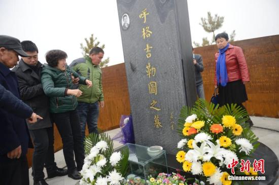 资料图:呼格吉勒图全家人来到呼格新墓前祭奠,呼格吉勒图骨灰在两天前迁入,墓志铭由法学家江平撰写。图为母亲尚爱云在儿子墓前悲痛哭泣。 中新社记者 刘文华 摄
