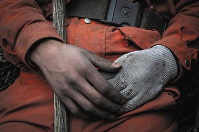 3月10日,连续数天的扑火工作后,战士们的手被熏黑了,手套也磨破了。