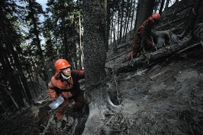 3月10日,扑火队员检查树木,排除复燃的可能性。火场断崖纵横,陡坡大都在50度以上,有的甚至达到70度以上。