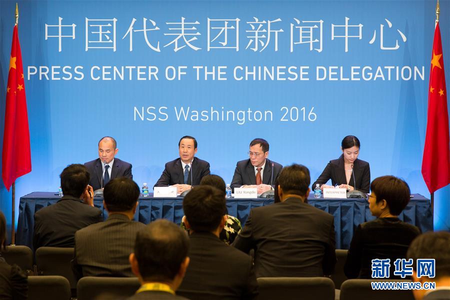 3月31日,在美国首都华盛顿,中国国家原子能机构主任许达哲(左二)在第四届核安全峰会期间出席吹风会。当日,中国国家原子能机构主任许达哲在华盛顿表示,中国政府积极履行核安保国际义务,与国际社会一道致力于提高全球核安保水平,付出了大量努力参与国际核安保体系建设。新华社记者李木子摄