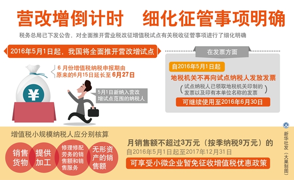 政策执行方面,财政部、税务总局布置各级财税部门要不折不扣落实好各项政策,确保政策落地。通过全面培训,使财税干部和企业财务人员吃准吃透政策要求,避免因对政策理解不到位、操作不准确造成企业税负增加,让企业充分享受改革红利。并加强对试点运行情况的跟踪分析,对于试点反映的新情况、新问题,及时采取措施,予以妥善解决。