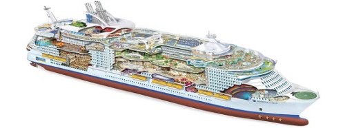 排水量达12万吨的海洋和谐号(Harmony of the Seas)宽66米,是历来最宽的游轮。它的长度达362米,比法国巴黎埃菲尔铁塔的高度还多出50米。此一巨大浮动城市的造价接近10亿欧元,共16层楼高,可运载6360个乘客和2100个船员。
