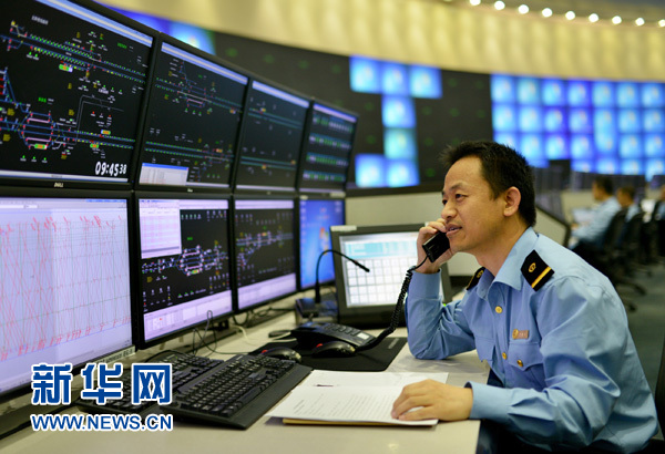 5月14日,工作人员在北京的北京铁路局调度指挥中心工作。从5月15日零时起,全国铁路将实行新的列车运行图。此次调图,从客运市场来看,铁路部门将大量增开旅客列车。新图共安排开行旅客列车3400对,其中动车组列车2100多对、普速列车1200多对,旅客列车较原图增加近300对。这是近10年来中国铁路实施的最大范围的列车运行图调整,也是铁路运输能力增量最大的一次调整。新华社发(杨宝森 摄)