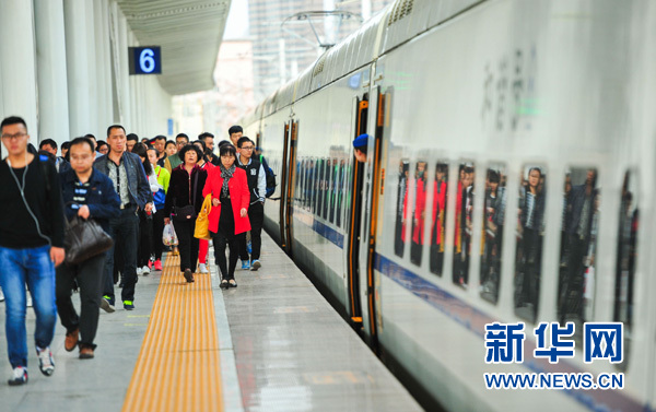 5月14日,在呼和浩特火车站,旅客们准备出站。从5月15日零时起,全国铁路将实行新的列车运行图。此次调图,从客运市场来看,铁路部门将大量增开旅客列车。新图共安排开行旅客列车3400对,其中动车组列车2100多对、普速列车 1200多对,旅客列车较原图增加近300对。这是近10年来中国铁路实施的最大范围的列车运行图调整,也是铁路运输能力增量最大的一次调整。新华社记者 连振 摄
