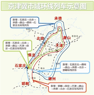 这两个线路圈几乎串起了北京铁路局管辖范围内河北省的所有地市,再加上北京、天津这样的铁路枢纽大站,“京津冀环行铁路圈”正式形成,大大满足了河北省各城市间环联互通的需求。据北京铁路局介绍,此次环行铁路的形成,要得益于此前津保铁路线和张唐铁路线的开通运营。没有这两条线的开通,京津冀的环行铁路就是残缺的。而在这两个运行圈里,唐山到承德之间的直通列车是亮点,以前,两地只能绕行中转天津。新图执行后,翻开了两地铁路直通的历史新篇章。