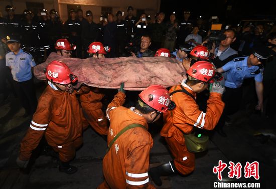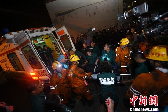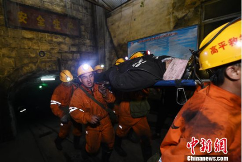 中新社记者在现场看到,公安、消防、医疗、救援等部门和机构的工作人员将狭小的出井口包围。当地警方调派人员将现场开辟出一条人墙通道,确保被困人员第一时间送至医院。