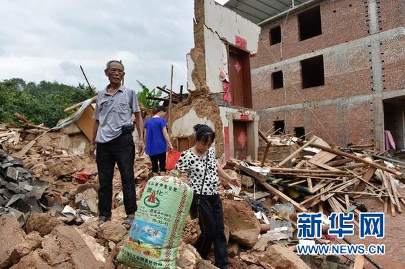 7月10日,在福建龙岩漳平市溪南镇溪南村,村民吴生木(左)和家人在被洪水冲毁的自家房屋废墟上整理物品。受今年第1号台风“尼伯特”影响,福建省龙岩漳平市普降暴雨,造成河水水位暴涨,并引发山体滑坡。据当地防汛部门提供的数据,漳平市有超过7700户、13000多人受灾。目前,在当地政府部门的帮助下,受灾群众正在积极开展自救。 新华社记者 宋为伟 摄