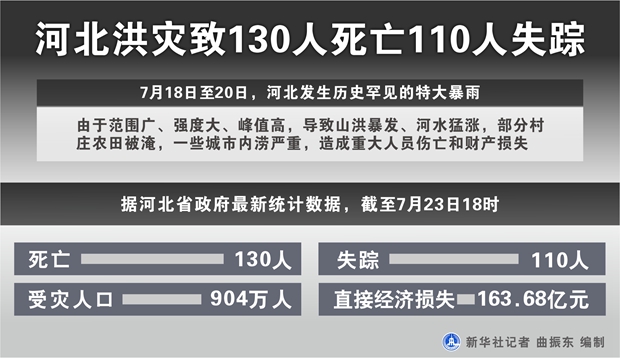 新华社石家庄7月24日电(记者范世辉)据河北省政府最新统计数据,截至23日18时,河北洪水受灾人口达904万,因灾死亡130人、失踪110人,直接经济损失163.68亿元。