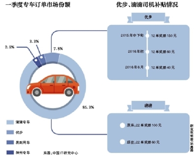 第三方数据研究机构中国IT研究中心近日发布的《2016年Q1中国专车市场研究报告》显示,一季度专车市场整体保持了高速增长,其中滴滴专车以85.3%的订单市场份额居行业之首,优步、易到用车及神州专车则分别以7.8%、3.3%和2.9%位列第二、三、四位。