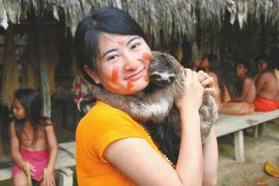 邓深很喜欢小动物,这是她在旅行中和树懒的合影。