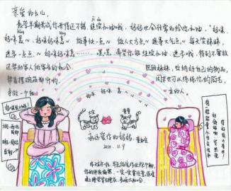 周艳告诉记者,她早些年学过工笔画,加之从事文字工作,便一直有记笔记的习惯,想起在外学习的女儿时,总是用笔写下来,并配上漫画,与女儿分享生活。“虽然孩子不在身边,我想让她内心更加丰富,更加强大。”周艳认为“用手写书信表达能过滤掉生活中的浮躁”,所以,她很少选择快餐式的电脑打印方式给女儿写信,而是自然而直接地“写写画画”。