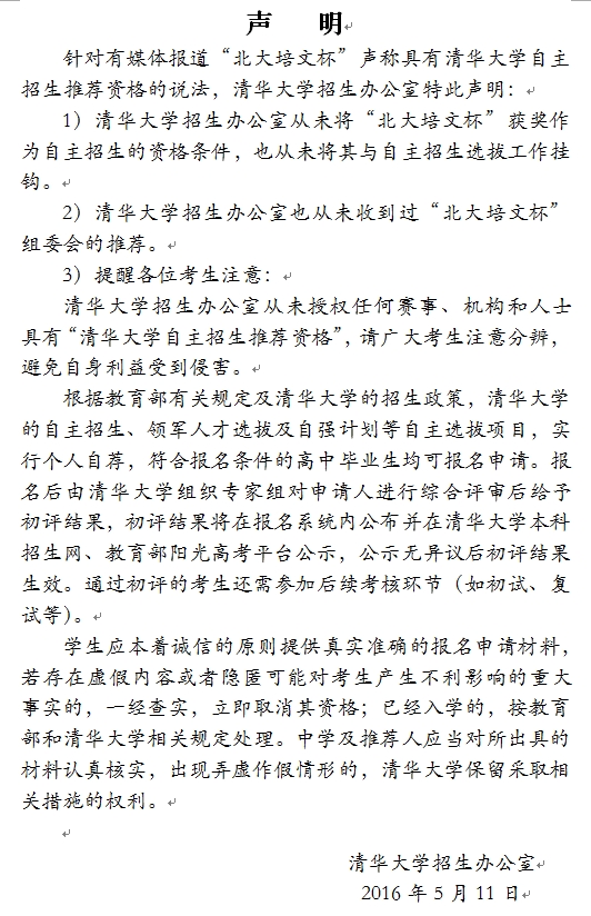 同时,针对“有媒体报道‘北大培文杯’声称具有清华大学自主招生推荐资格”的说法,清华大学招生办公室声明称,清华大学从未将“北大培文杯”与自主招生选拔工作挂钩,也从未将获奖作为自主招生的资格条件。清华大学从未授权任何赛事、机构和人士具有“清华大学自主招生推荐资格”。
