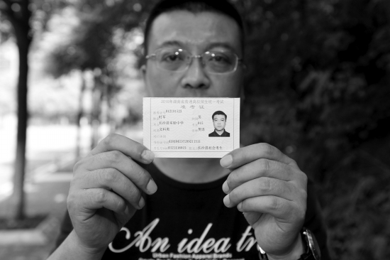 5月30日,长沙县招生办附近,时军向记者展示他的准考证。图/记者华剑
