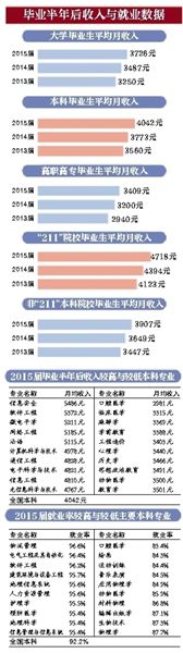 同时,“211”院校2015届毕业生月收入4718元比2014届4394元增长了324元,比2013届4123元增长了595元;非“211”本科院校2015届毕业生月收入3907元比2014届3649元增长了258元,比2013届3447元增长了460元。连续三届呈现上升趋势。