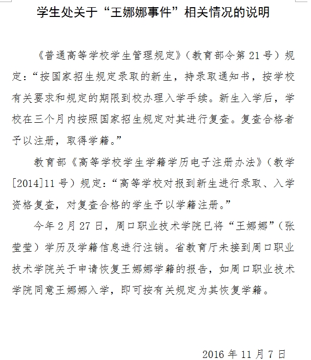 《河南省教育厅学生处关于“王娜娜”事件的情况说明》