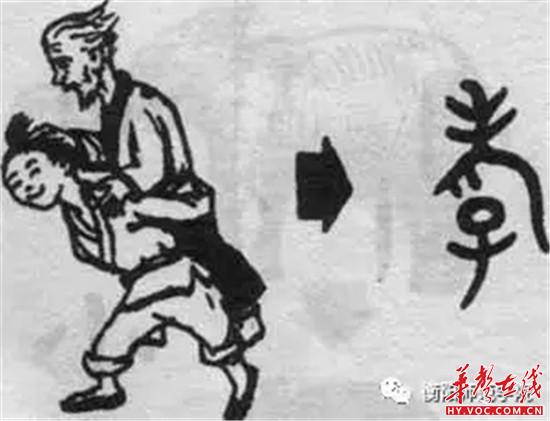 “孝道”文化是中国特有的,它有着悠久的历史。据考证,甲骨文中就已经出现“孝”字。“孝”是一个会意字,它的意思是小子搀扶着长着长长胡须的老人。