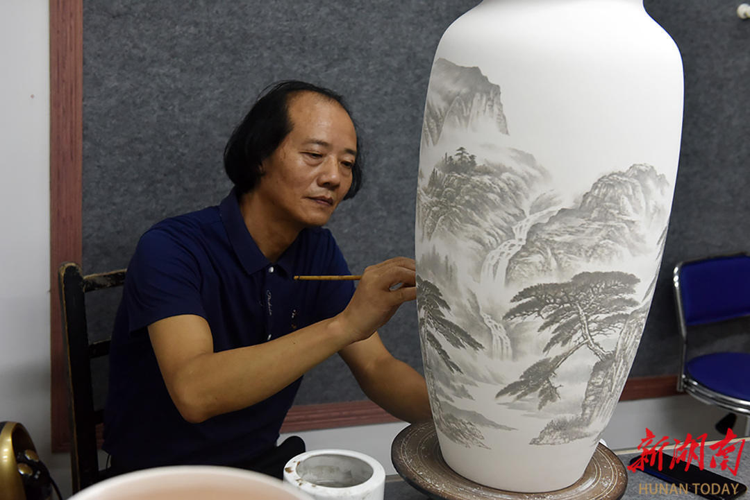 “界牌釉下五彩瓷制作讲究白如玉、亮如镜、声如磬、薄如纸的特点。”瓷艺传习所里,凌文武捧着曾思叶制作的拉坯作品:孩子拉的坯体厚度已达标,工艺制作技术快赶上老手了。”