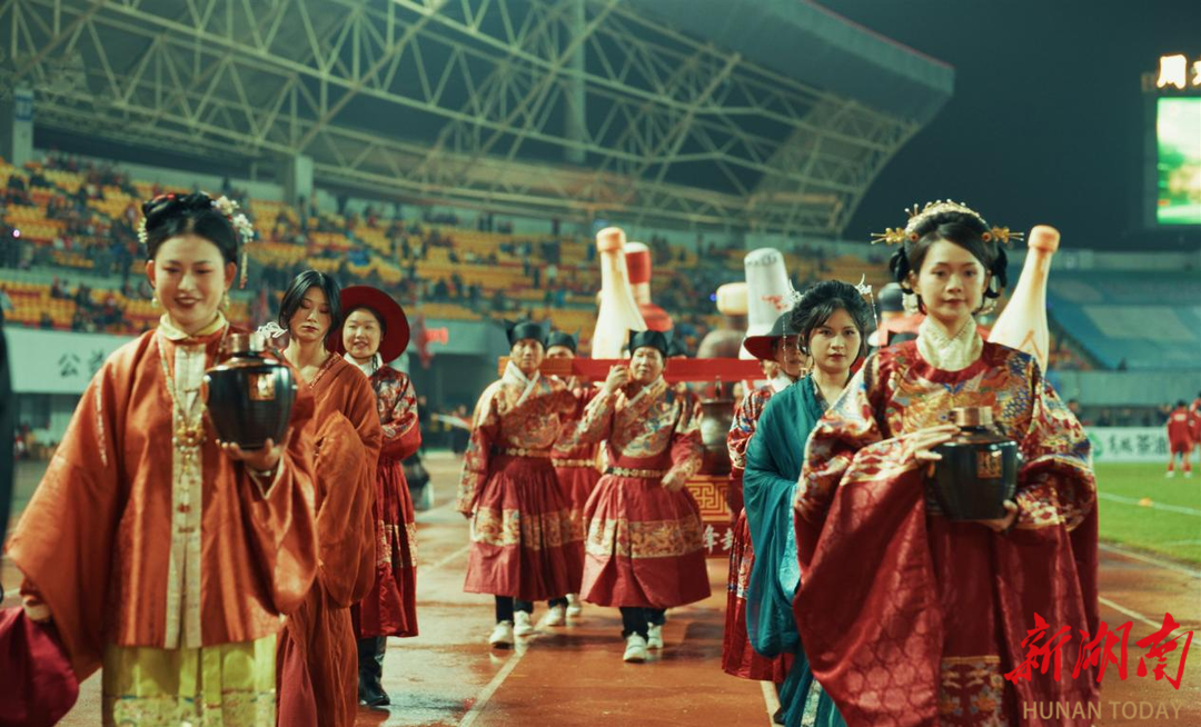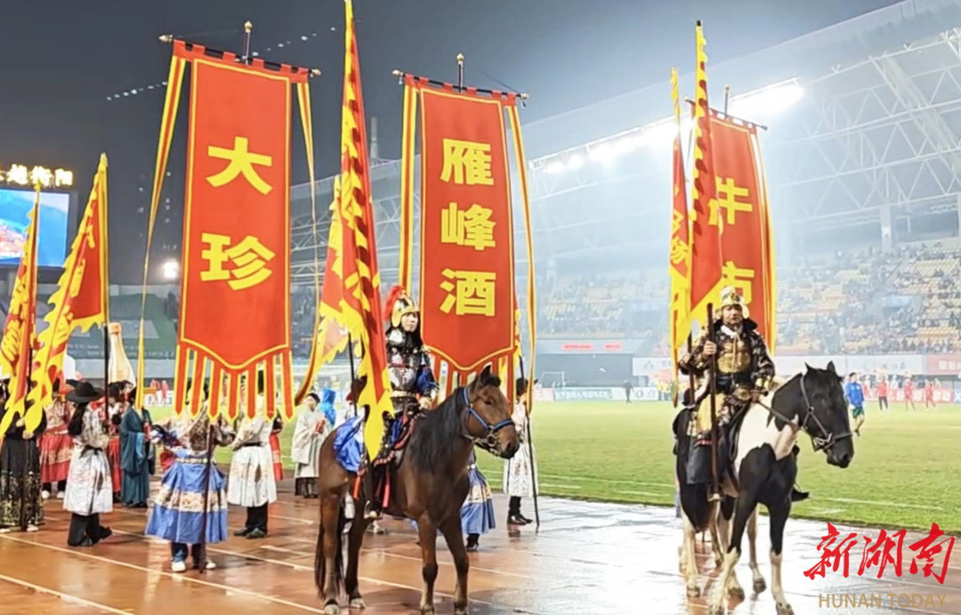 队伍前方,是身披盔甲,高举“雁峰酒”字旌旗的骑兵方阵,紧随其后的是衡阳餐饮品牌。马蹄声碎中,“高度”瓶模和着20名身穿汉服的少女以舞步再现“舟载车运”的艰辛。在湘菜与湘酒的交织中,传递飘香世界的韵味与故事。节目高潮处,现代足球元素与古礼完美交融,让古代贡酒礼仪与现代足球激情完成跨越千年的对话。此时的体育场内仿佛传来浑厚的画外音:“公元2025年,雁峰酒人以足球为媒,复现公元280年酃酒入洛阳之盛况——这杯中物曾醉倒魏晋名士,今朝亦当润泽湖湘热土!”