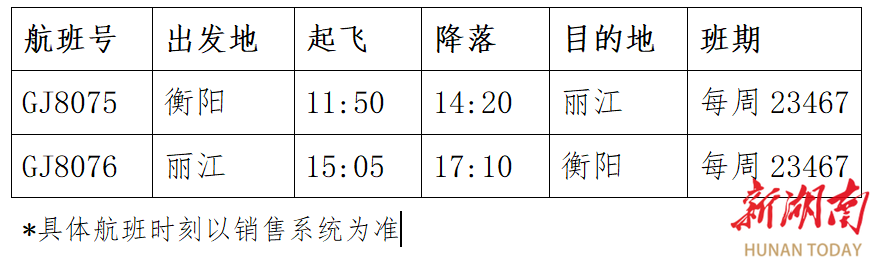 湖南日报·新湖南客户端11月5日讯(记者 唐曦 通讯员 匡林)近日记者从衡阳南岳机场获悉,10月26日起长龙航空全新开通GJ8075/76温州=衡阳=丽江航线!乘长龙从衡阳出发,可前往丽江、温州,从东海之滨到滇北秘境,遇见不一样的风景。