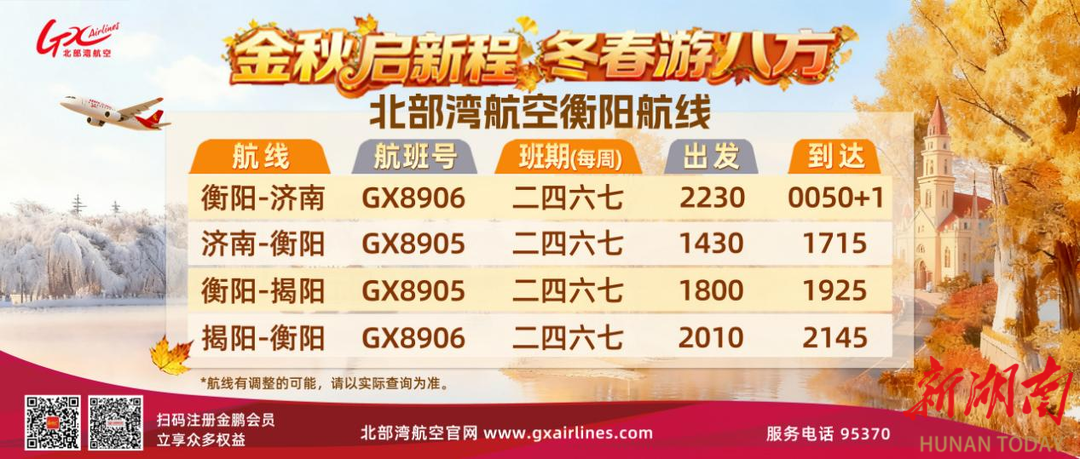 湖南日报·新湖南客户端11月5日讯(记者 唐曦 通讯员 匡林)近日,新海航旗下北部湾航空全新开通衡阳往返济南、衡阳往返揭阳航线,航班号为 GX8905、GX8906,班期为每周二、四、六、七,开航期间特价机票只需300元起,带你感受泉城古韵与潮汕风情。