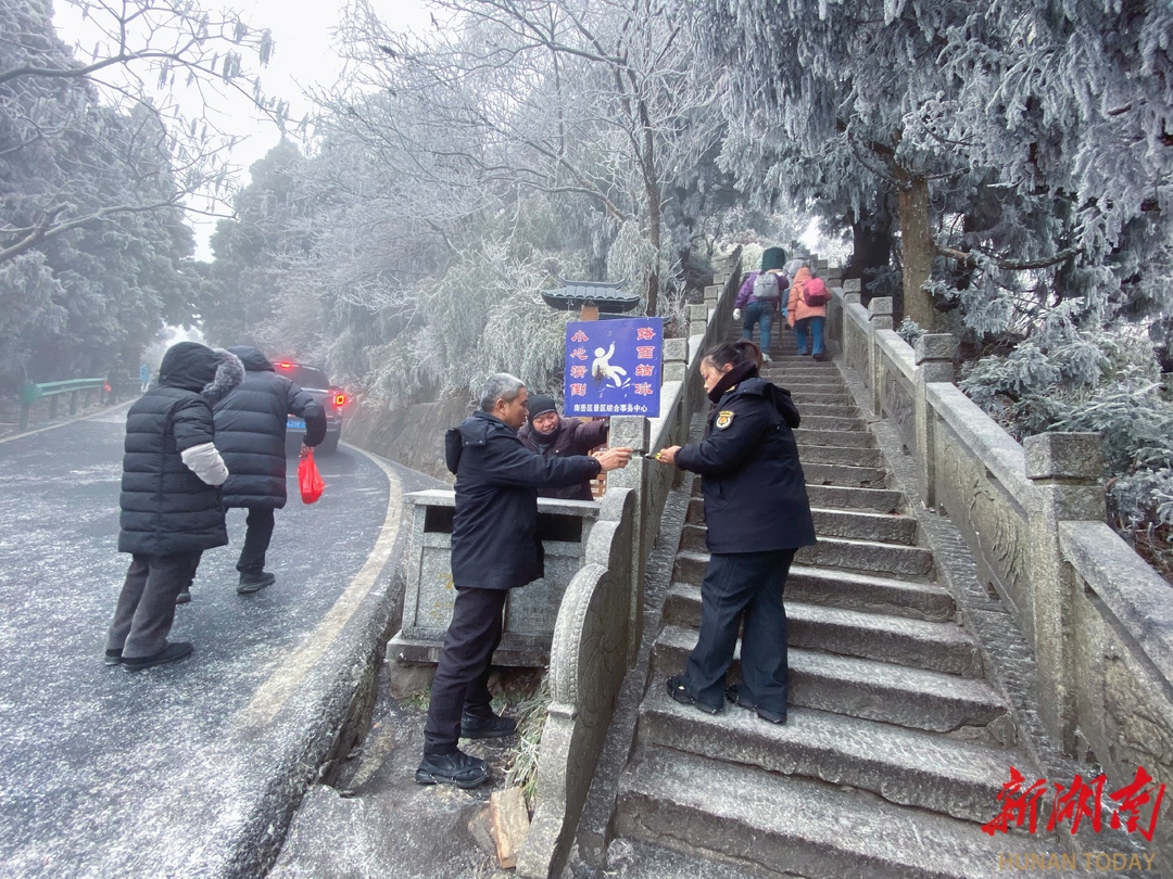 皑皑冰雪间,暖心服务处处涌动。铁佛寺服务点、祝融峰暖心驿站等多个点位,工作人员为游客递上热气腾腾的姜茶与热水;景区配送的一次性雨衣、红糖等物资,文旅集团提供的糖果与巧克力,成为游客抵御严寒的“能量包”;南天门场站开放空调,为游客打造温暖的避风港。寿岳乡的干部辅警耐心安抚滞留中山沟的游客,公路养护中心则加紧开展除冰作业,助力游客安全返程,贴心举措赢得了游客的一致好评。