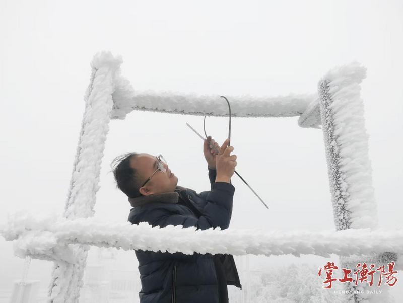 南岳高山气象站气象观测员正在测量电线积冰情况。丁心 摄