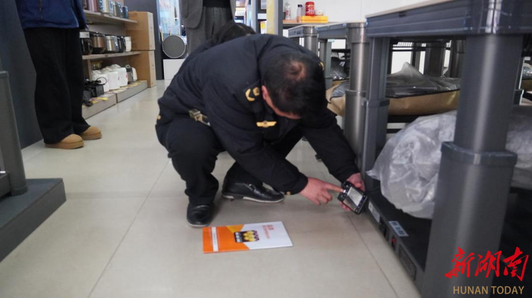 在苏宁易购青阳中路店,执法人员重点检查电取暖桌等冬季热销产品,逐一核验CCC强制认证标识、熄火保护装置等安全关键项目,严防不合格产品流入市场。