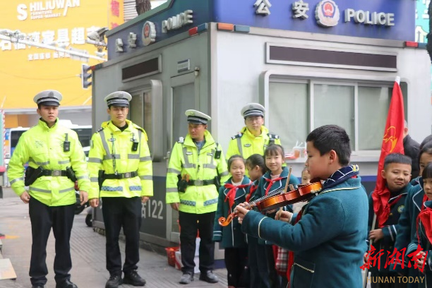 随后,精彩的文艺表演拉开序幕。孩子们献上了精心排练的小提琴演奏和舞蹈表演,灵动的旋律、活泼的舞姿,为寒风中的岗亭增添了浓浓暖意,也让坚守岗位的交警叔叔们露出了欣慰的笑容。表演结束后,孩子们还展示了印有“恪尽职守保畅通,师生暖心敬英雄”的横幅,用稚嫩的声音传递着文明交通的理念。