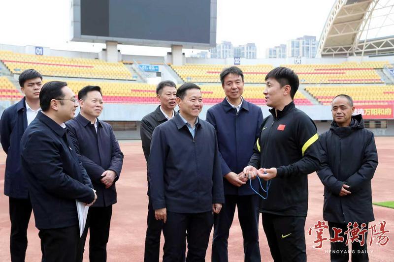 3月6日下午,刘中杰在市体育中心体育场调研“湘超”衡阳队训练情况。
