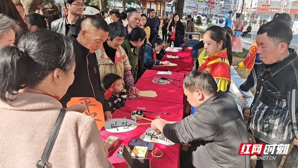 活动全程,戏台前广场的书法美术作品展同步开展,成为一道独特的文化风景线。寒假期间各班学生的书法作品整齐陈列,笔墨间尽显少年风采,吸引了不少居民驻足观赏。现场设置的“小小讲解员”们自信从容,用稚嫩的声音为参观者介绍作品背后的创作思路与感悟,互动交流间,既展现了学生的综合素质,也让传统文化与雷锋精神深度融合。